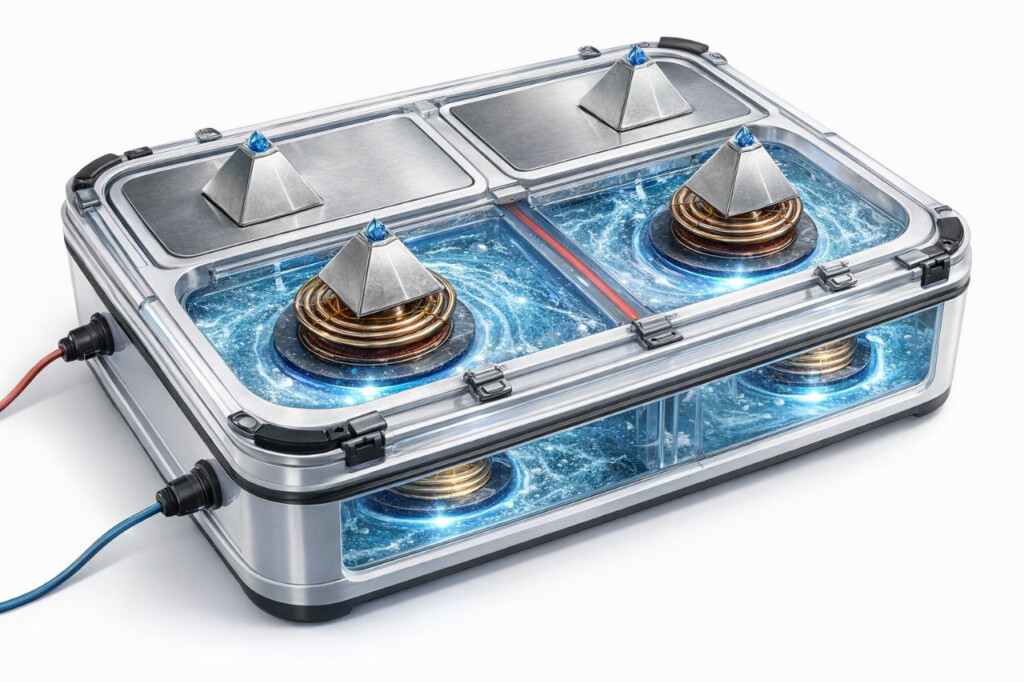 While the helmet works on the cranial field, this rectangular base for the feet closes the complete body circuit — from the crown to the sole, creating a whole-body resonant field.